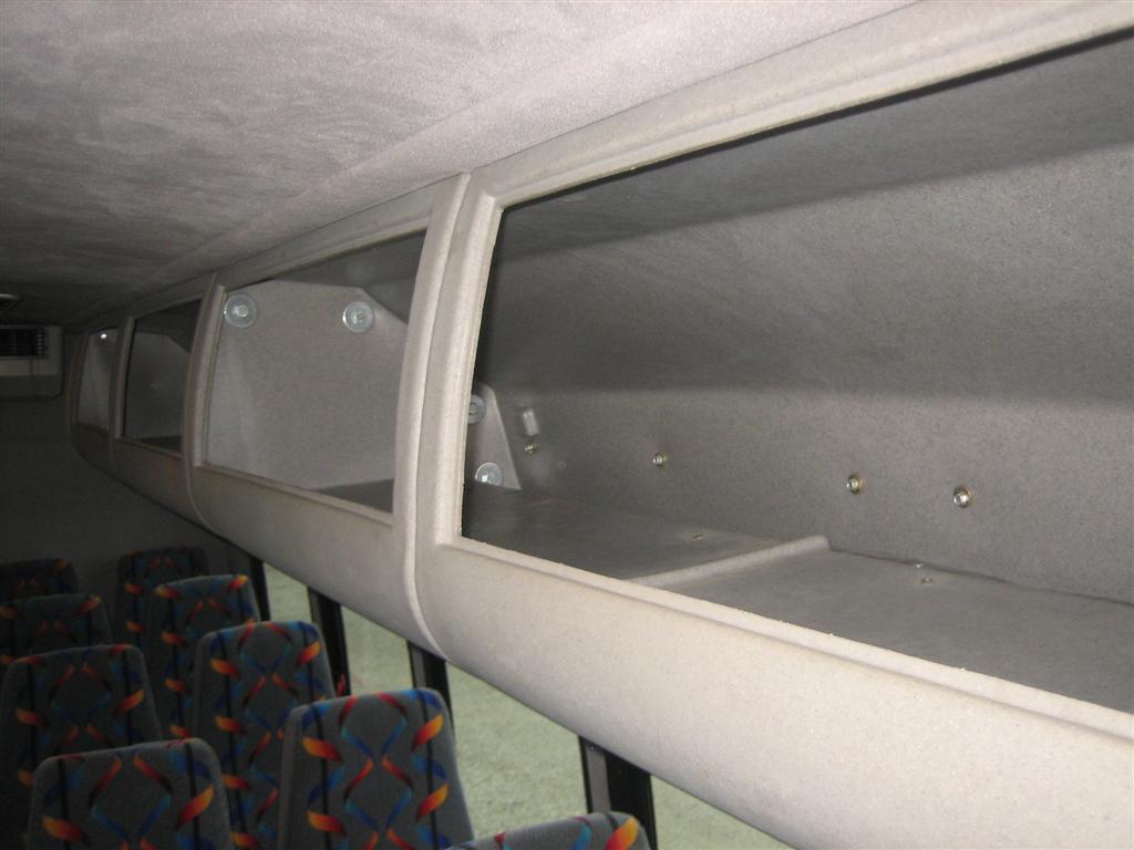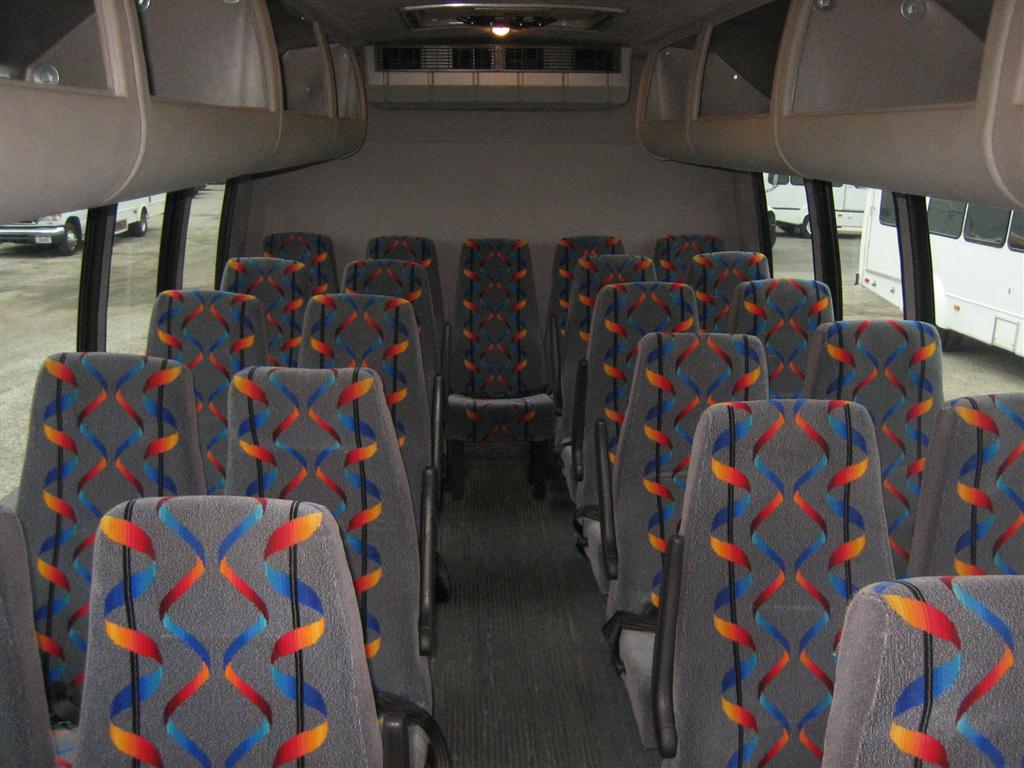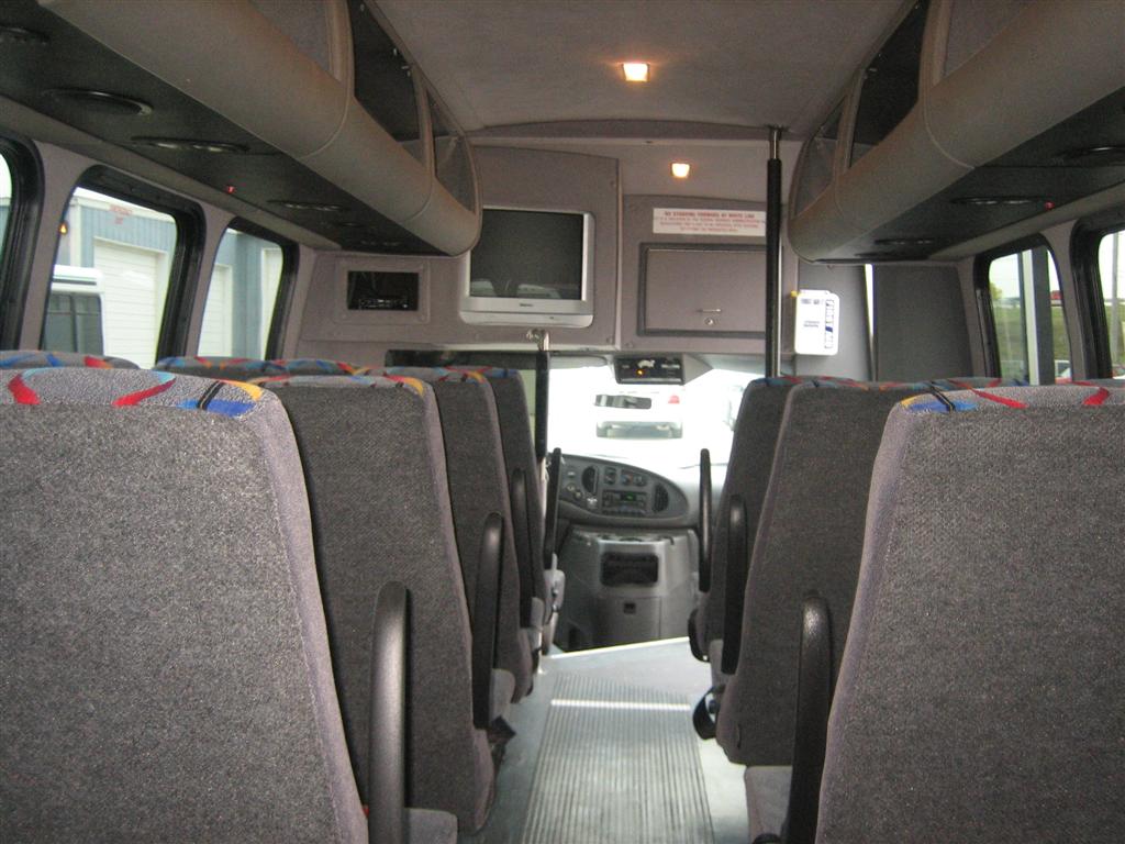 Interior Description About A 2005 FORD E-450It comes well equipped with cruise control, overdrive, electric entry door, manual windows/locks, dash AC, AM/FM/CD player, tilt steering wheel, PA system, Freedman high back cloth reclining seats with seatbelts, overhead luggage, dedicated rear luggage compartment, rear AC unit, roof hatch, SONY TV, Flexvision DVD/VCR, individual reading lights, rear speakers, first aid kit, 6 emergency exits, and much more!